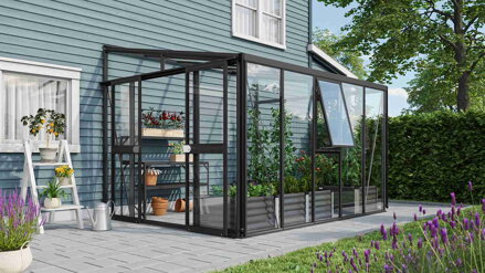 Hliníkový skleník, š 460 x d 266 cm, čierna farba, 3x bočné okno, sklo 3 mm + PC 10 mm, plocha 12,23 m2.